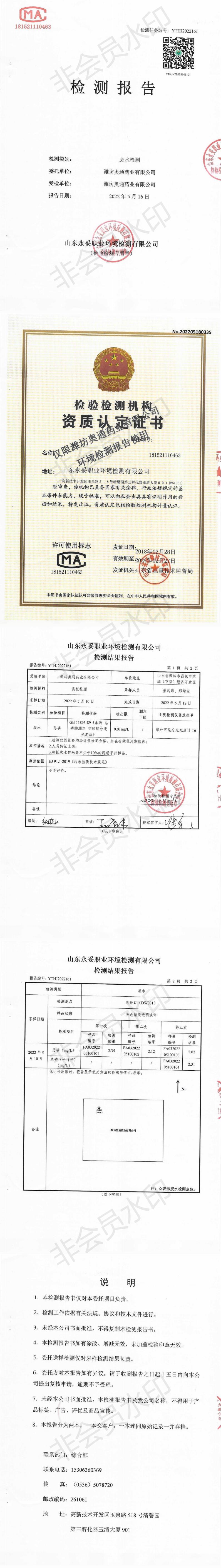 濰坊奧通藥業(yè)有限公司五月環(huán)境檢測(cè)報(bào)告