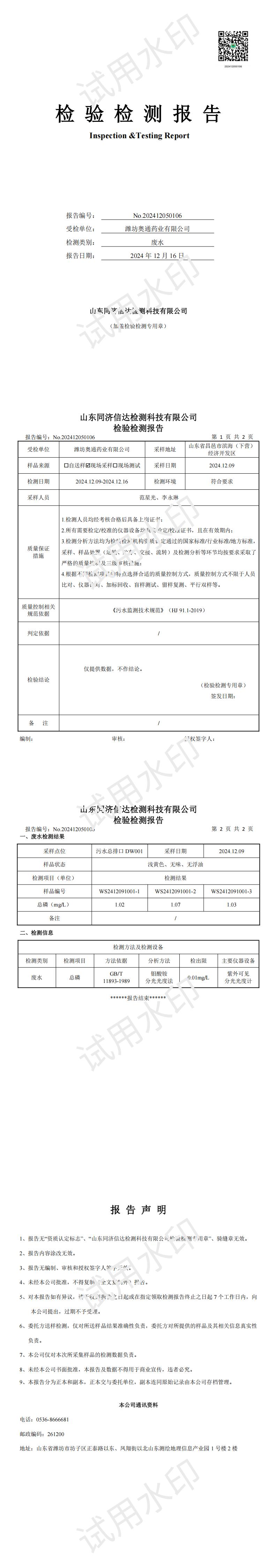 濰坊奧通藥業(yè)有限公司十二月環(huán)境檢測(cè)報(bào)告